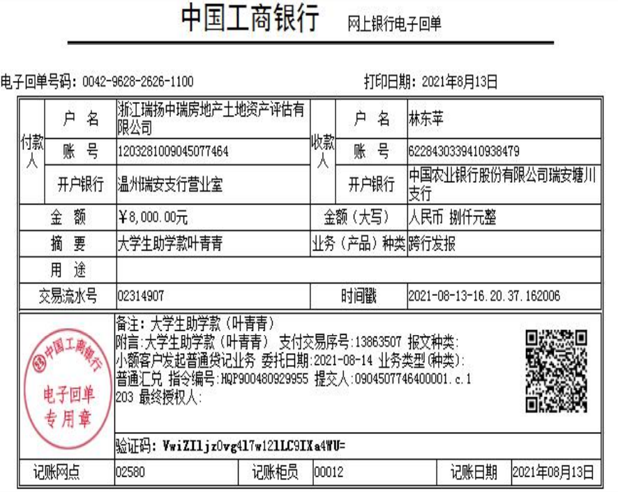 6、2021年8月13日瑞扬中瑞评估公司捐赠大学生助学款8000元。